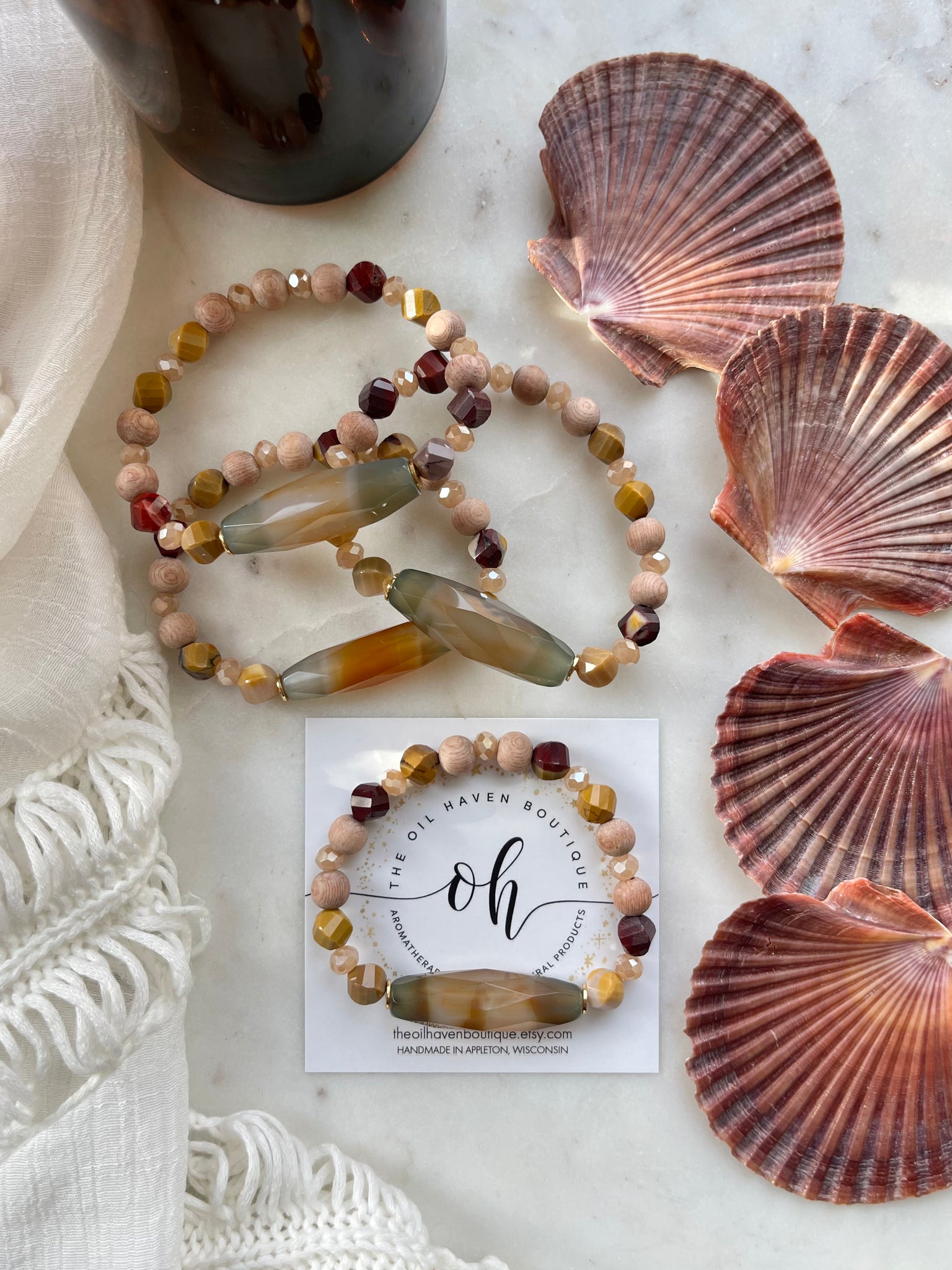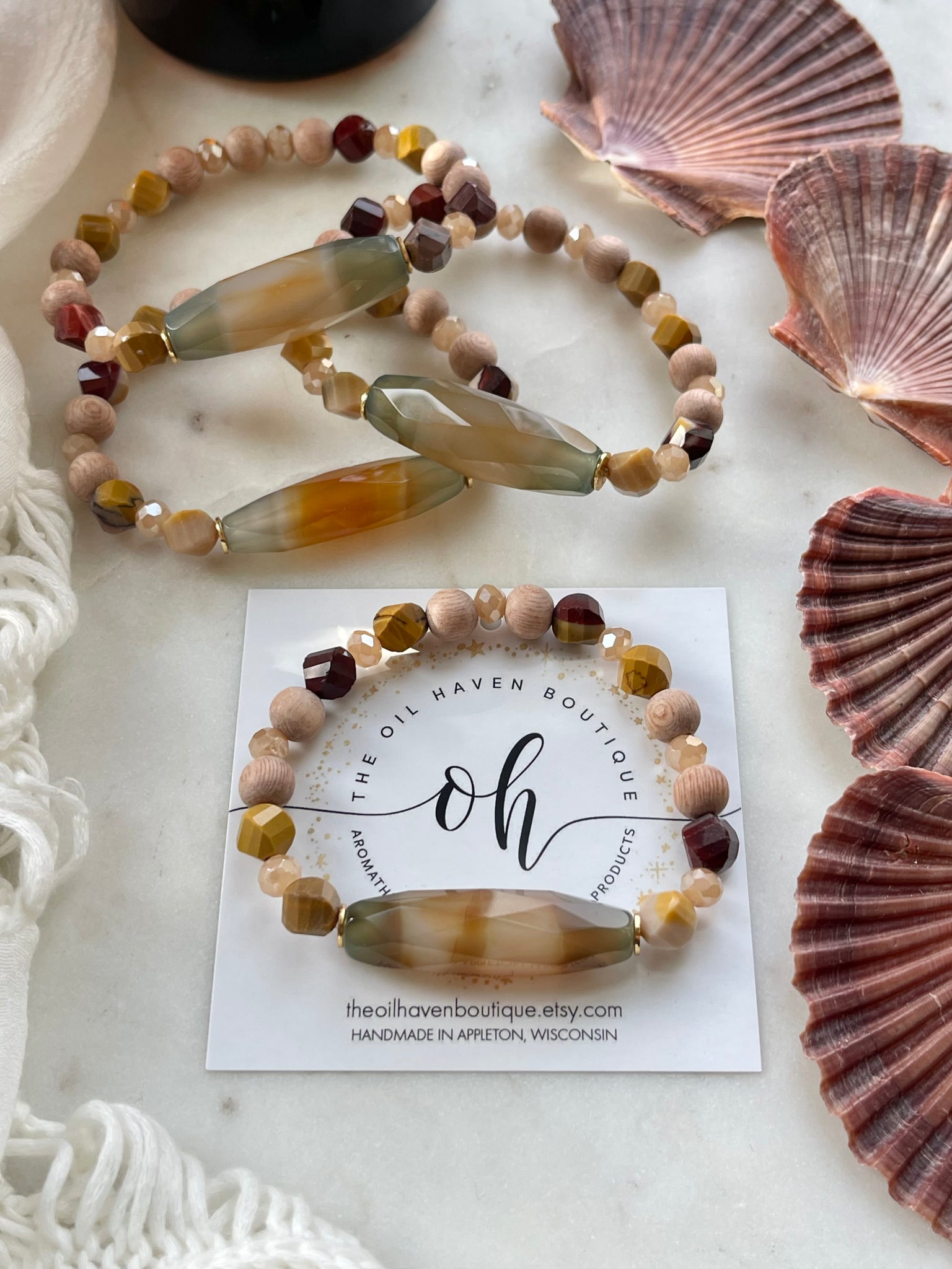 Large Agate gemstone focal bead with starry Mookalite, Czech beads and 18k gold slices. Add essential oils to the wood beads and enjoy the therapeutic benefits all day.