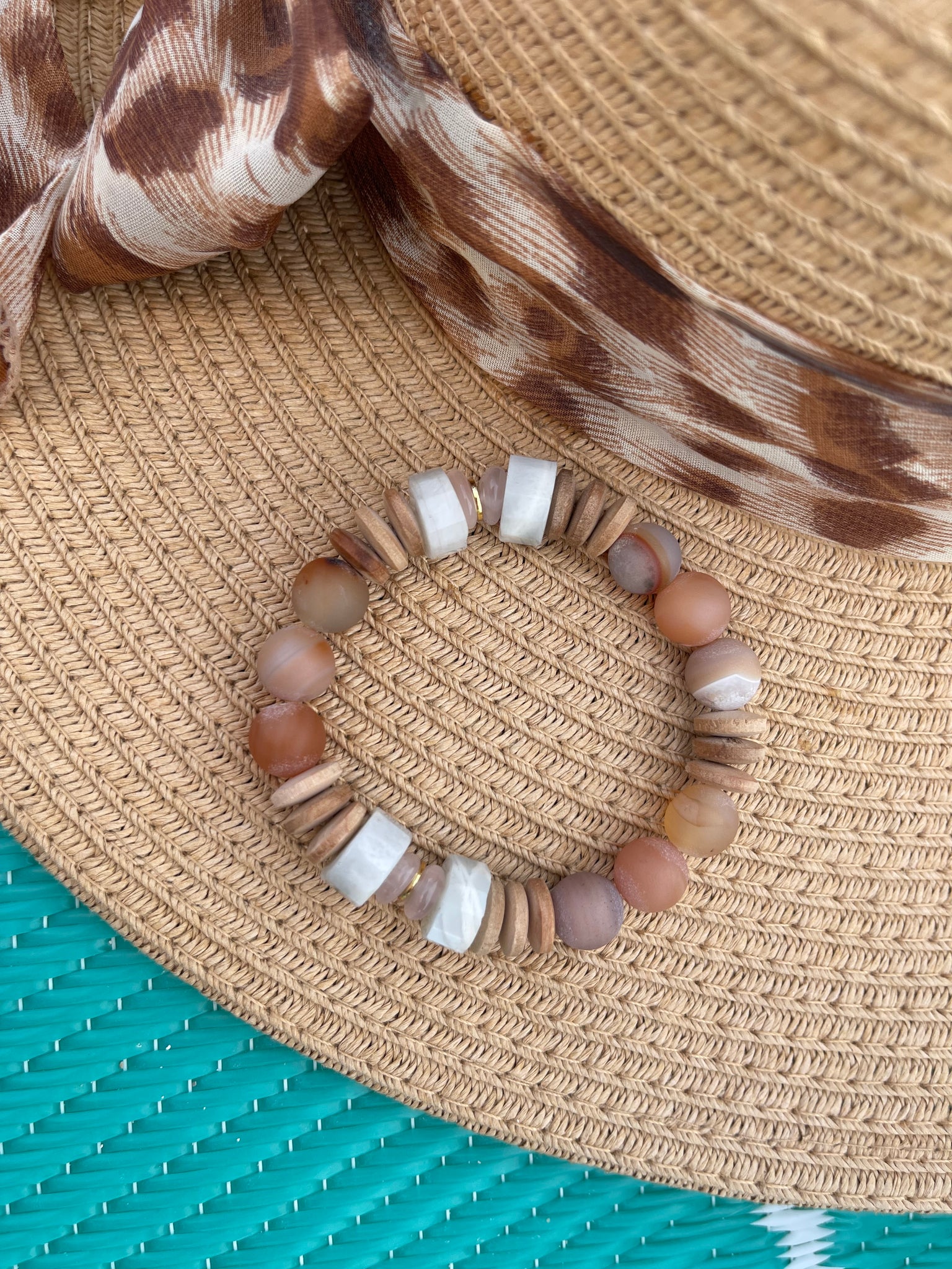Gorgeous Faceted Moonstone Roundels, Rose Quartz with 18k gold slices & Champagne Colored Druzy Gemstones make this a stunning diffuser bracelet! Add essential oils to the wood beads for all day aromatherapy.
