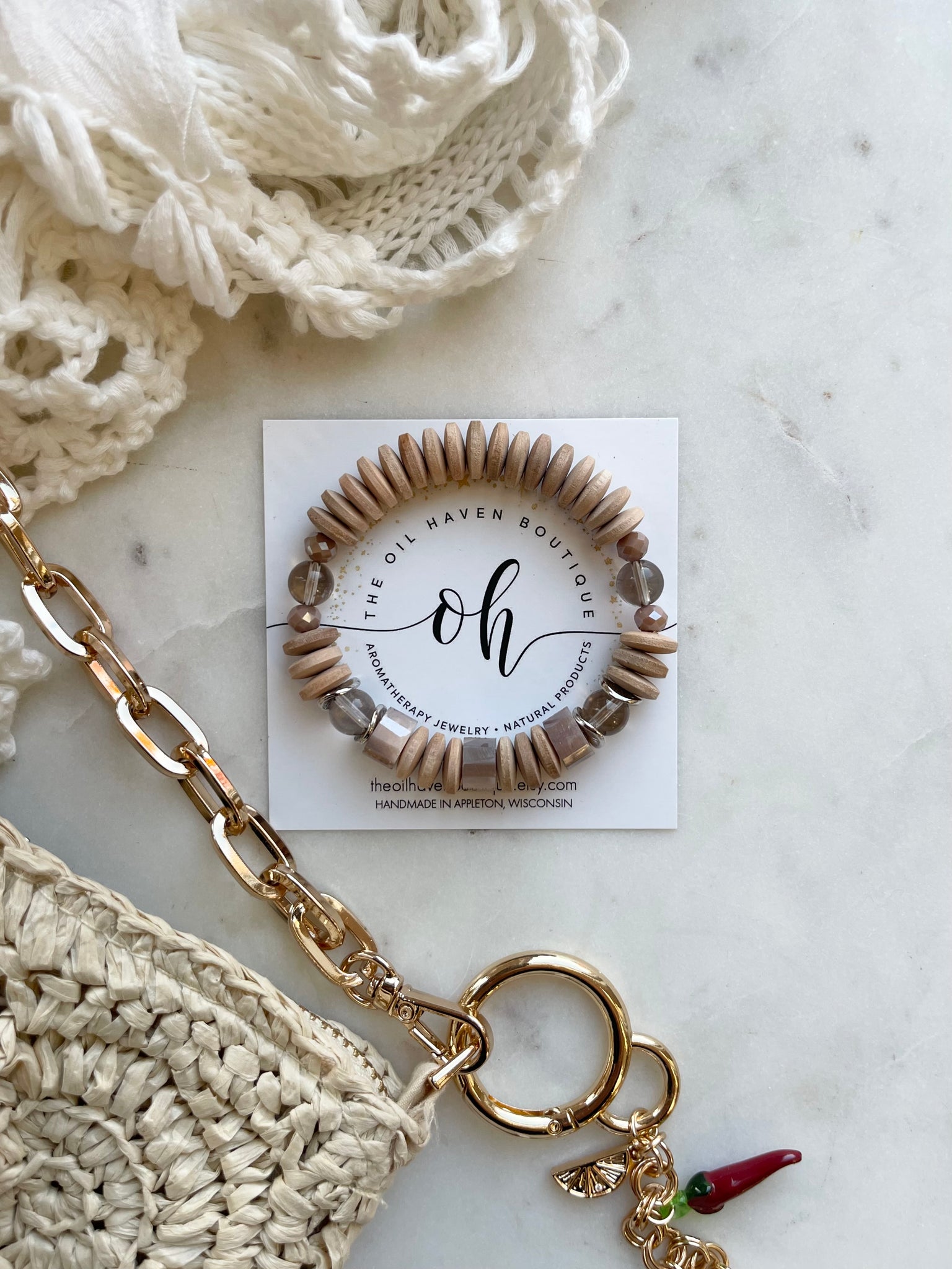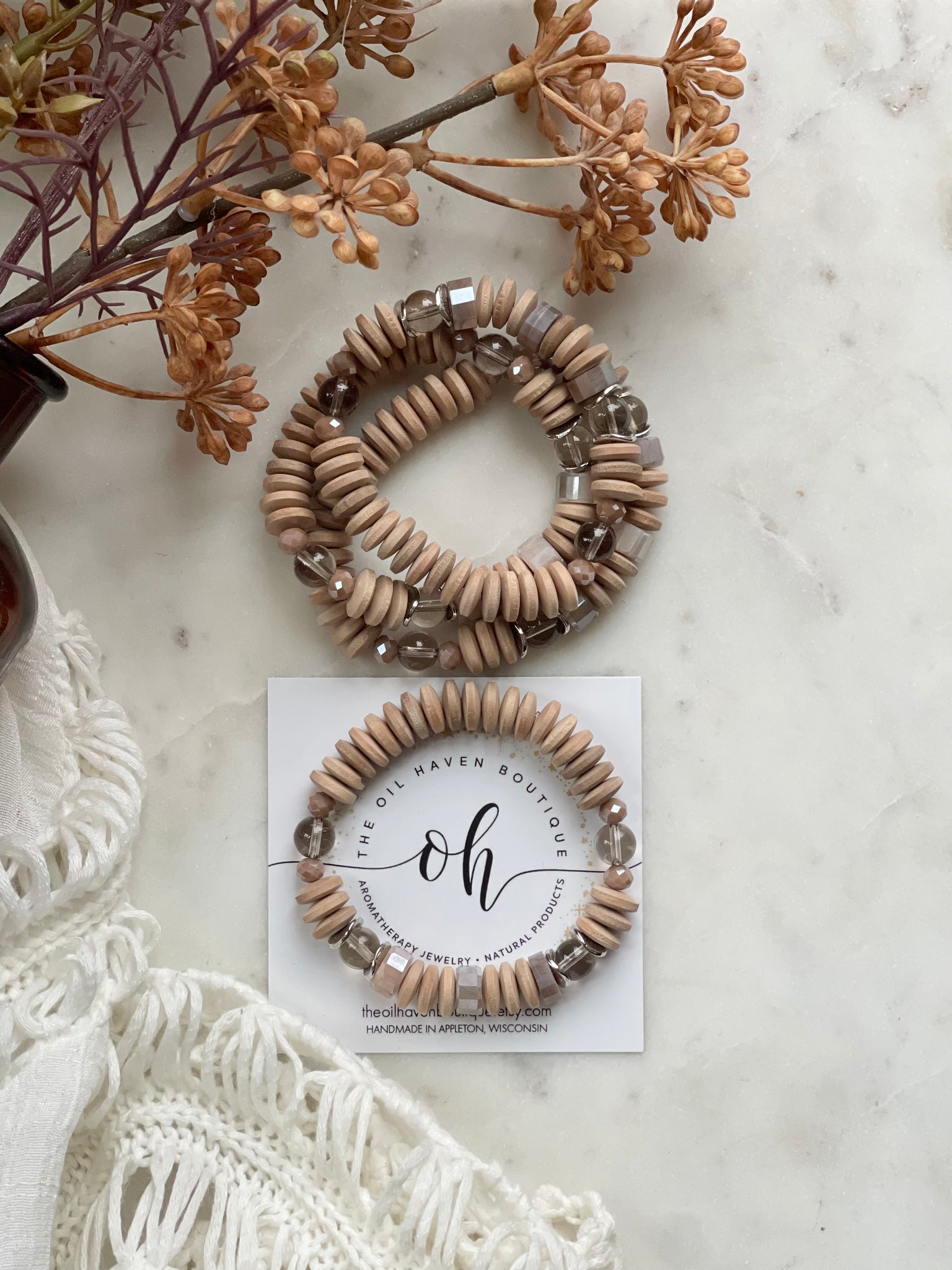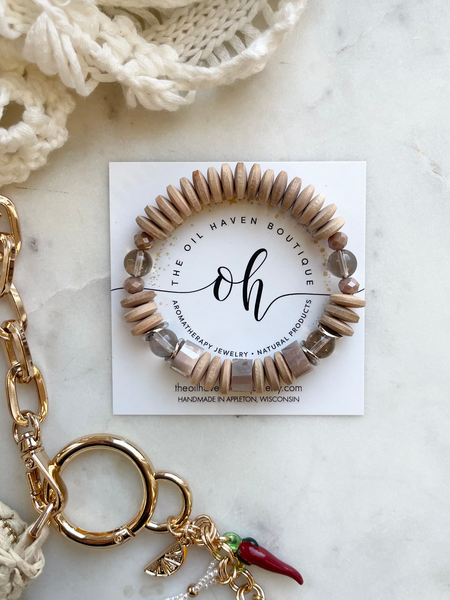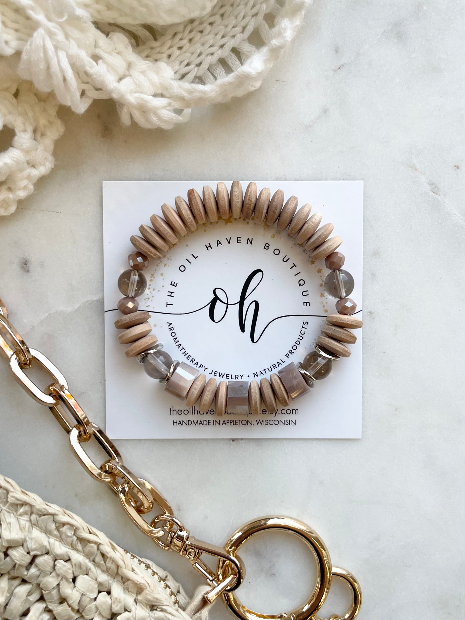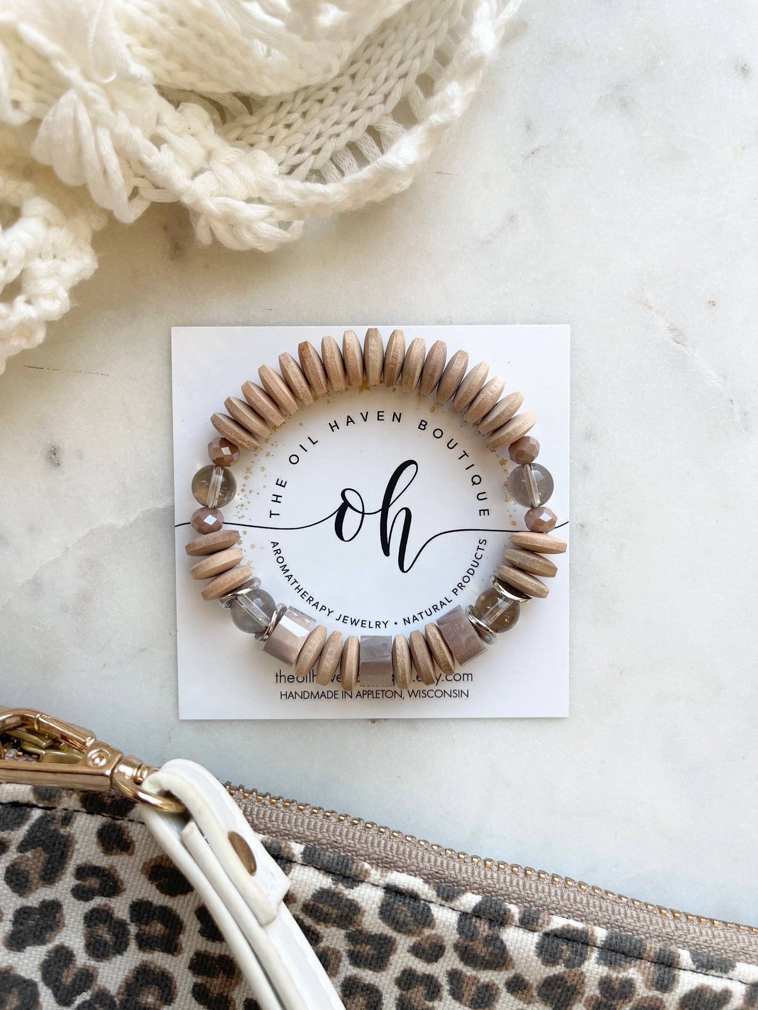 A blend of beach serenity and natural sophistication — the Driftwood Glow bracelet brings soft, sun-washed tones to your everyday look. Handcrafted with faceted mystic moonstone, smooth natural wood beads, smoky crystal gemstone accents, and neutral hues inspired by warm sand and driftwood, it’s the perfect piece for lovers of coastal calm and minimal boho style.