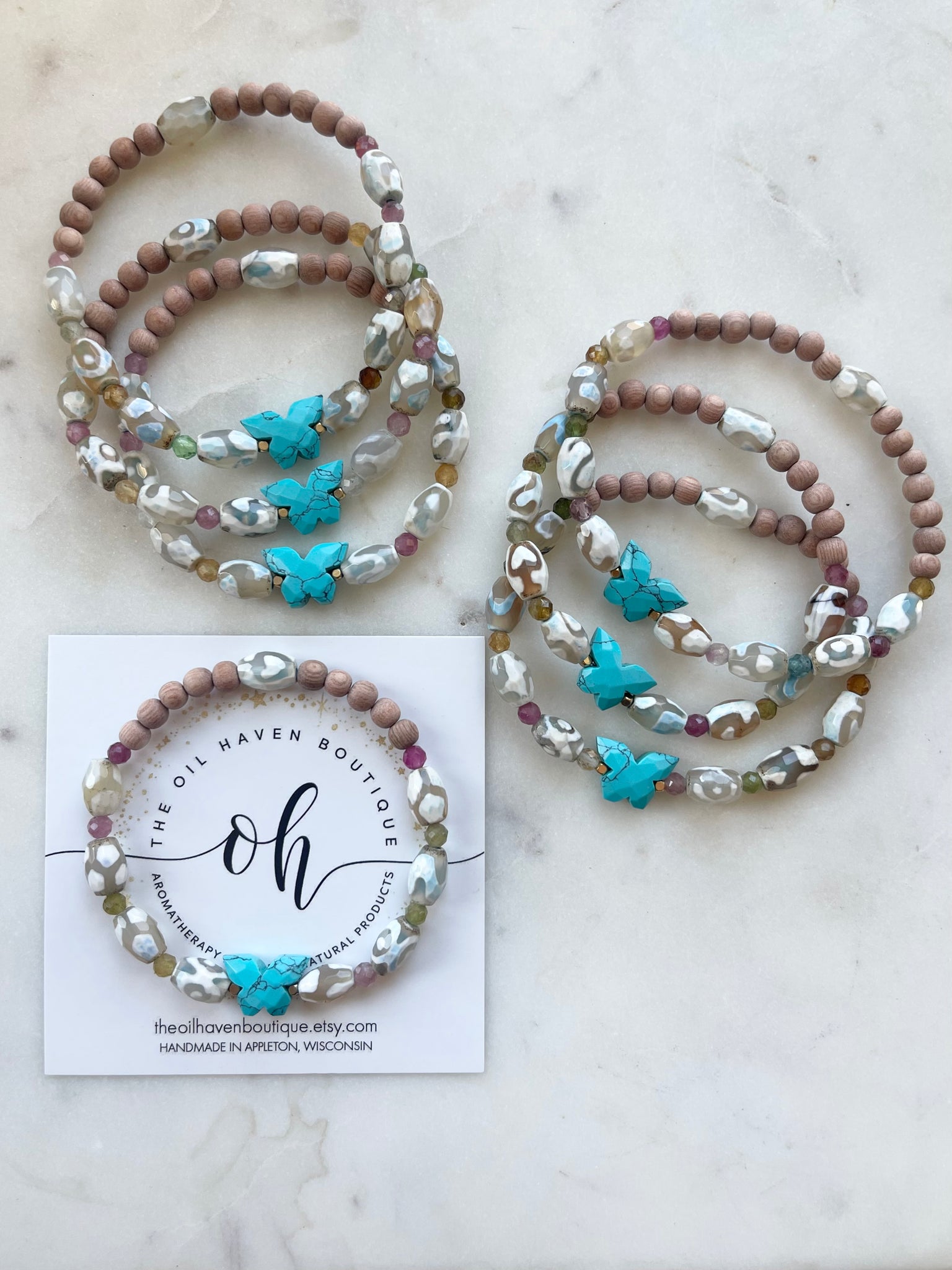 A dreamy mix of natural turquoise butterflies, earthy Tibetan agate beads and tiny faceted tourmaline handcrafted to inspire transformation, calm, and effortless boho beauty. Add essential oil to the wood beads for aromatherapy all day while you go about your day!