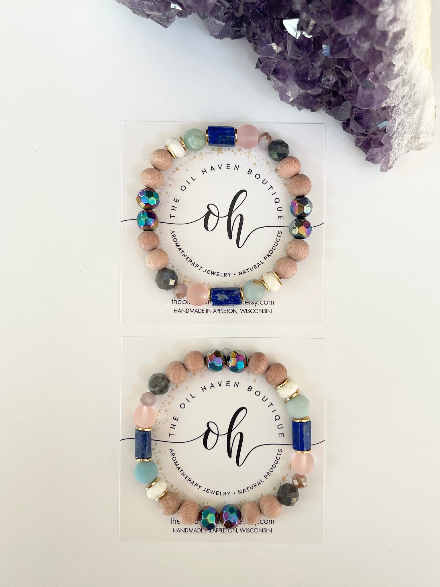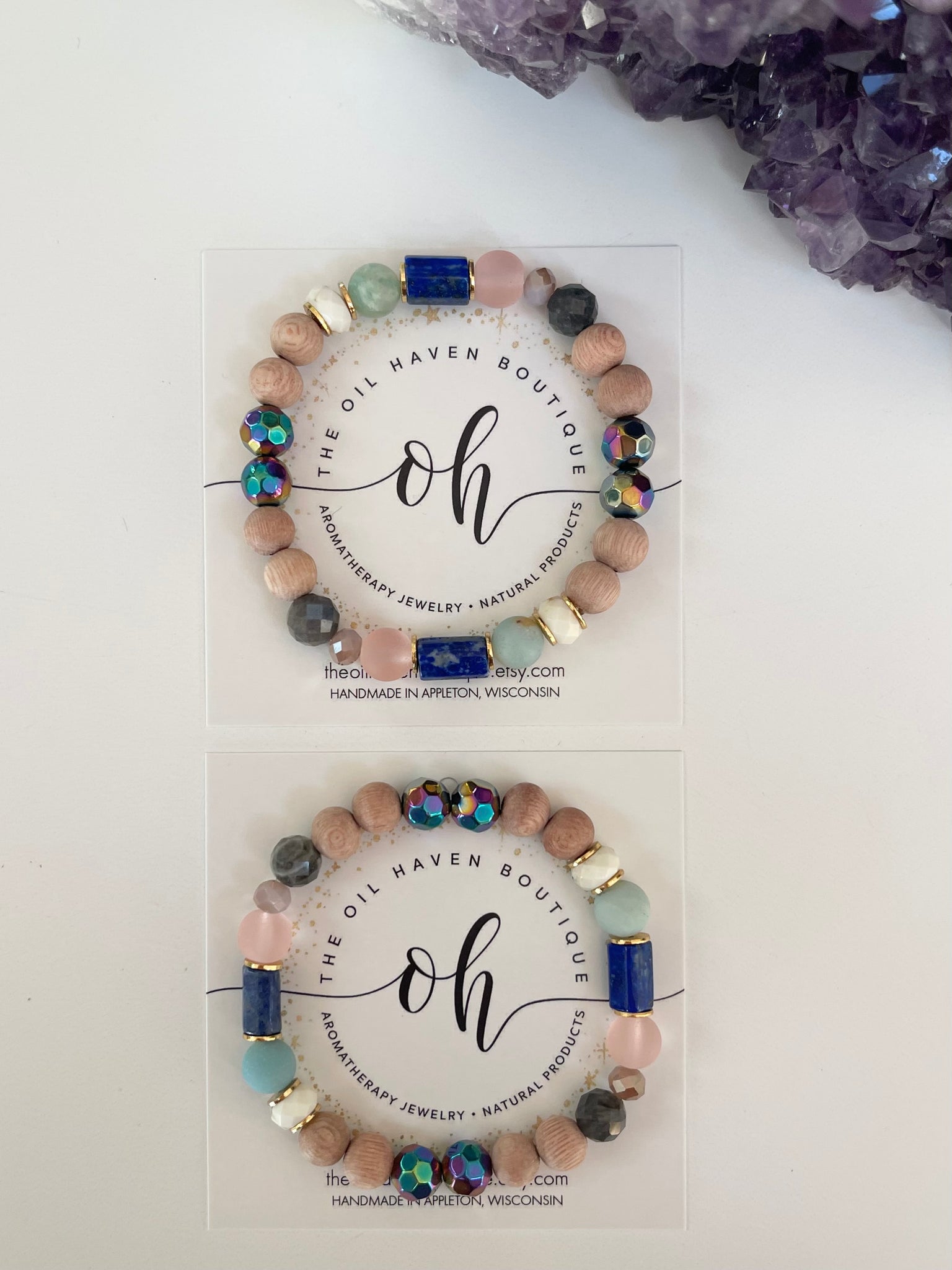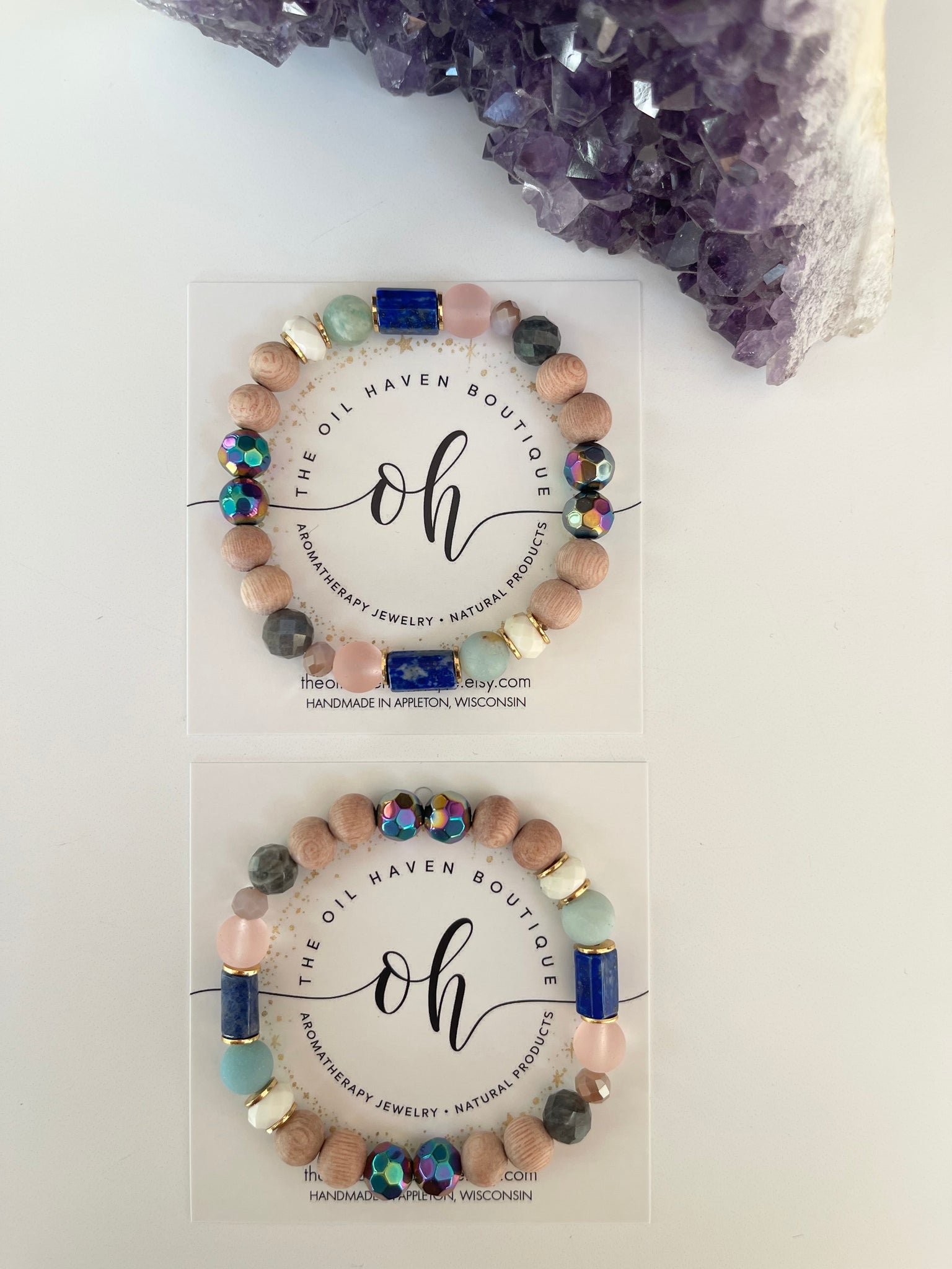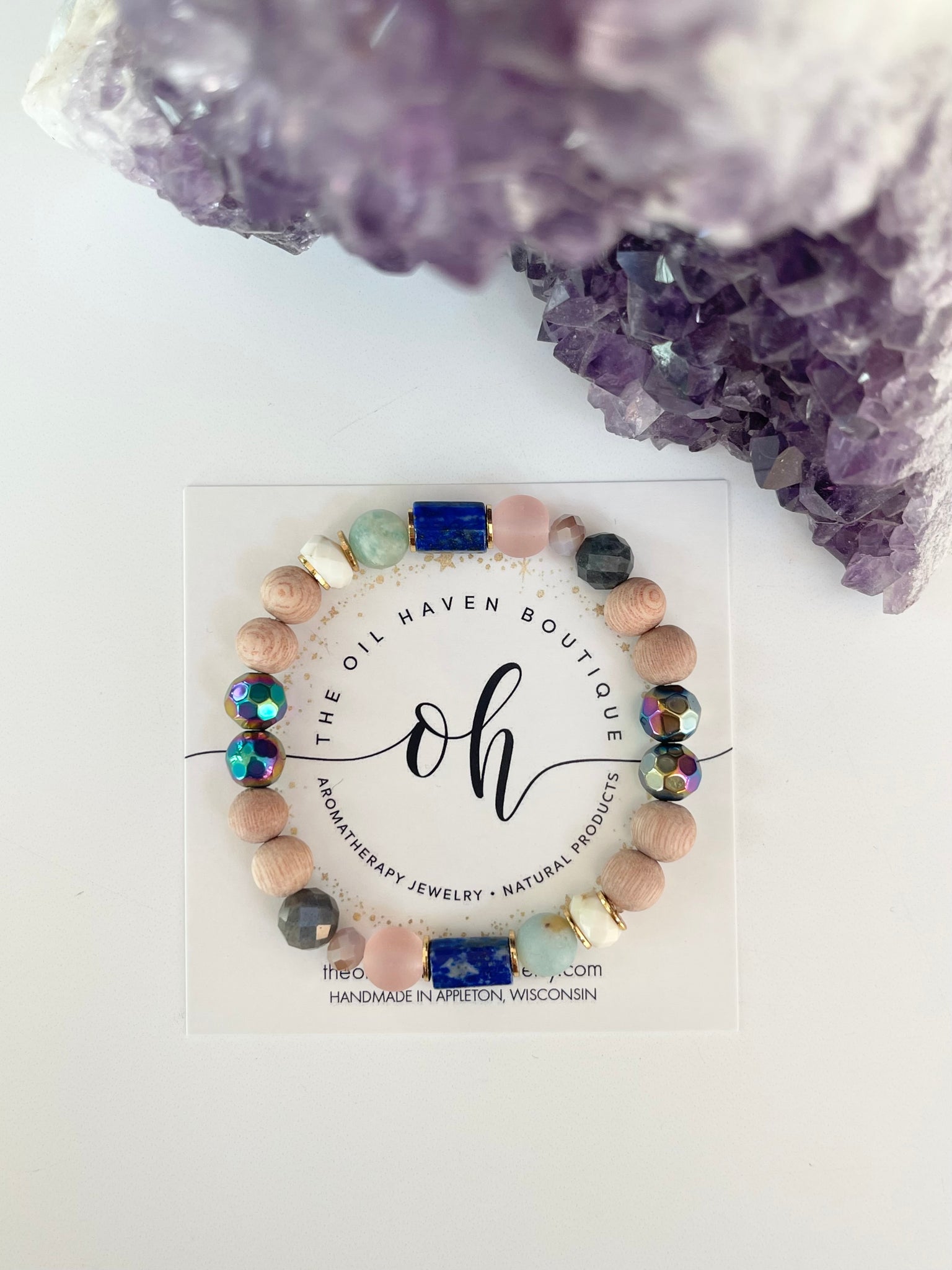 A mix of colorful gemstones, 18 k gold and some faceted rainbow hematite! Add essential oil to the wood beads to elevate your vibe.
