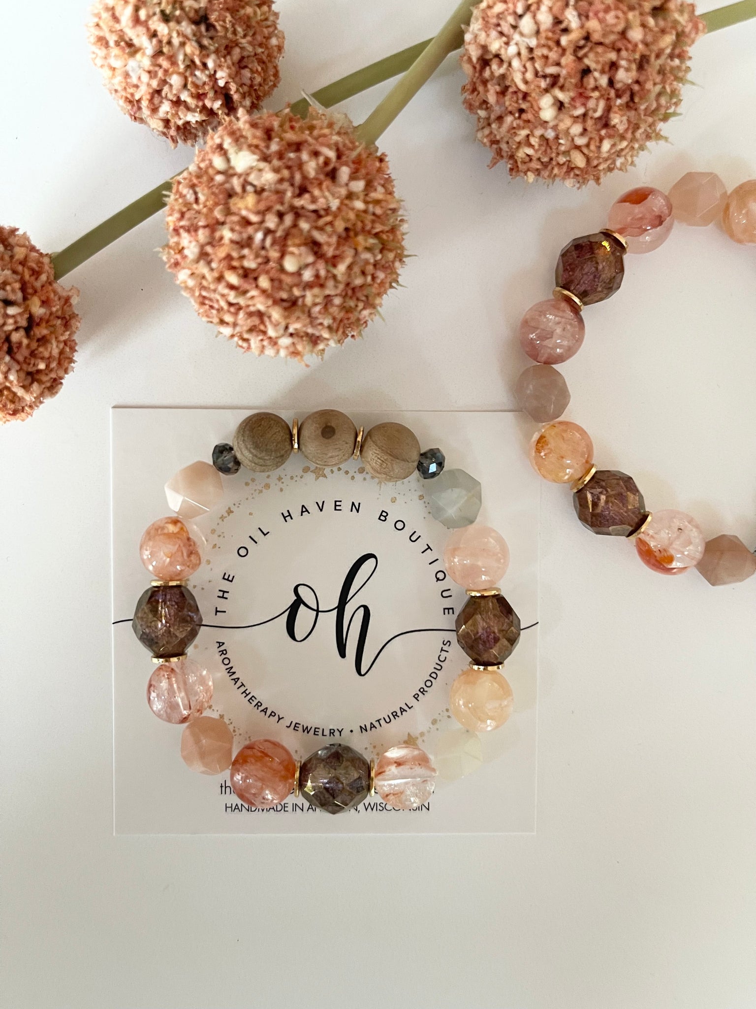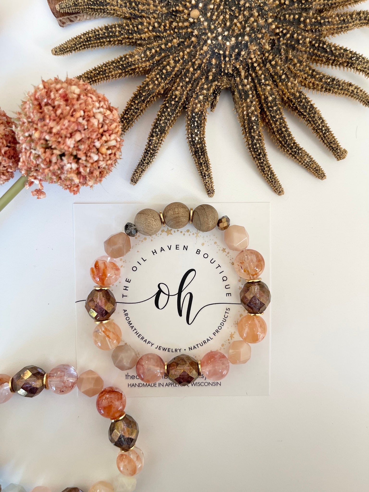 Soft fall tones, gorgeous gemstones with some popping fire polished Czech beads and 18k gold slices! Add essential oil to the sandalwood beads and enjoy the therapeutic benefits all day!