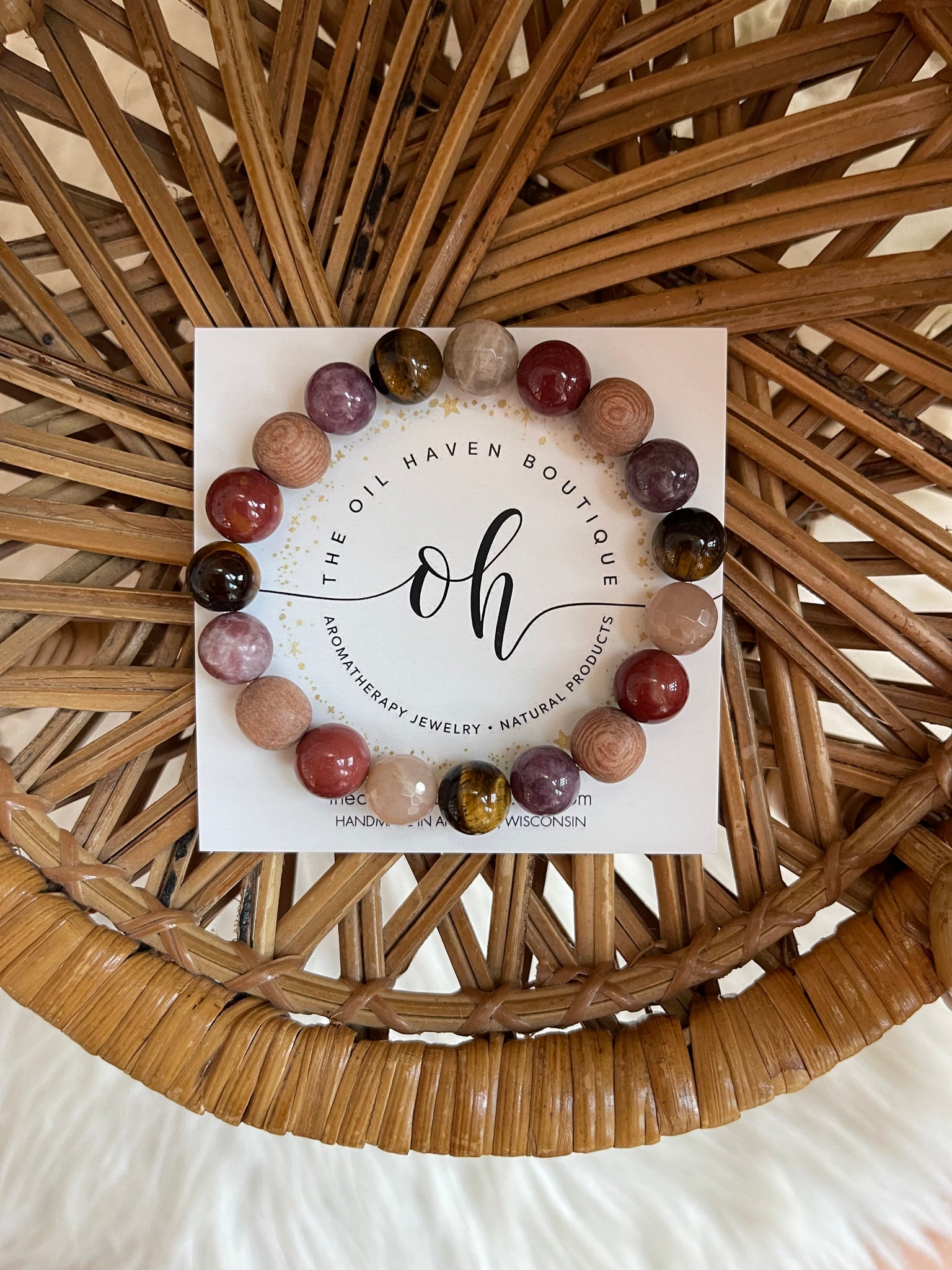 A medley of fine gemstones! Tigers eye, Sunstone, Mookalite, Lepidolite and Rosewood! Add essential oil to the wood beads to elevate your vibe!