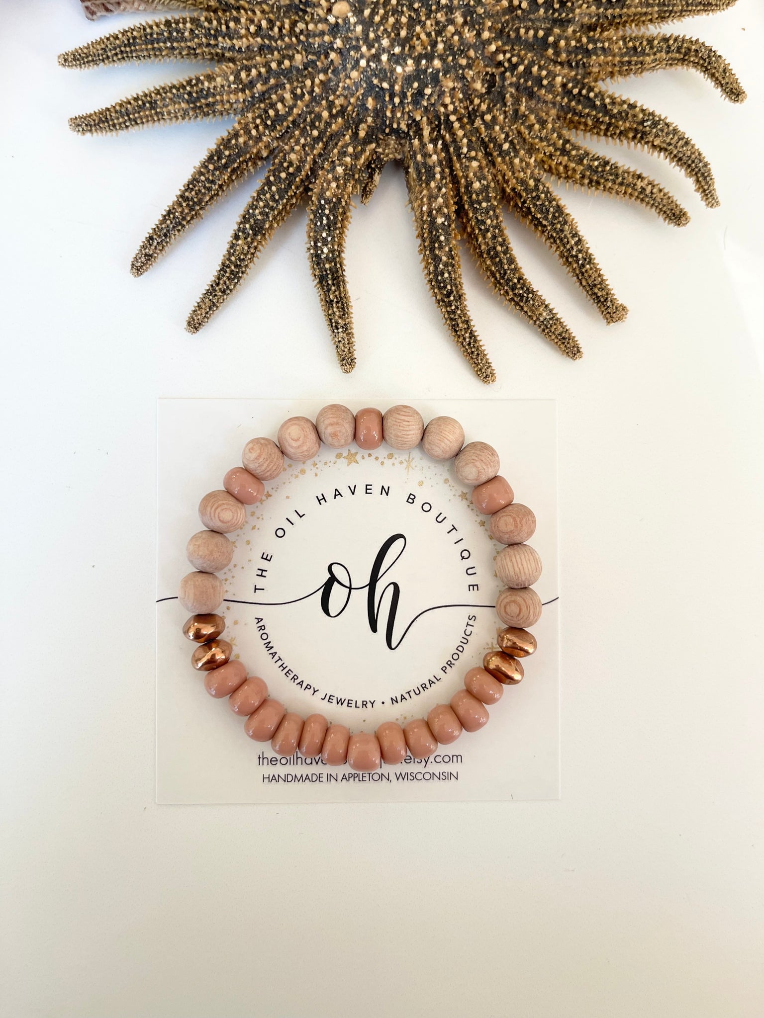 Mauve saucers and rose gold! Add essential oils to the wood beads and enjoy the therapeutic benefits all day!