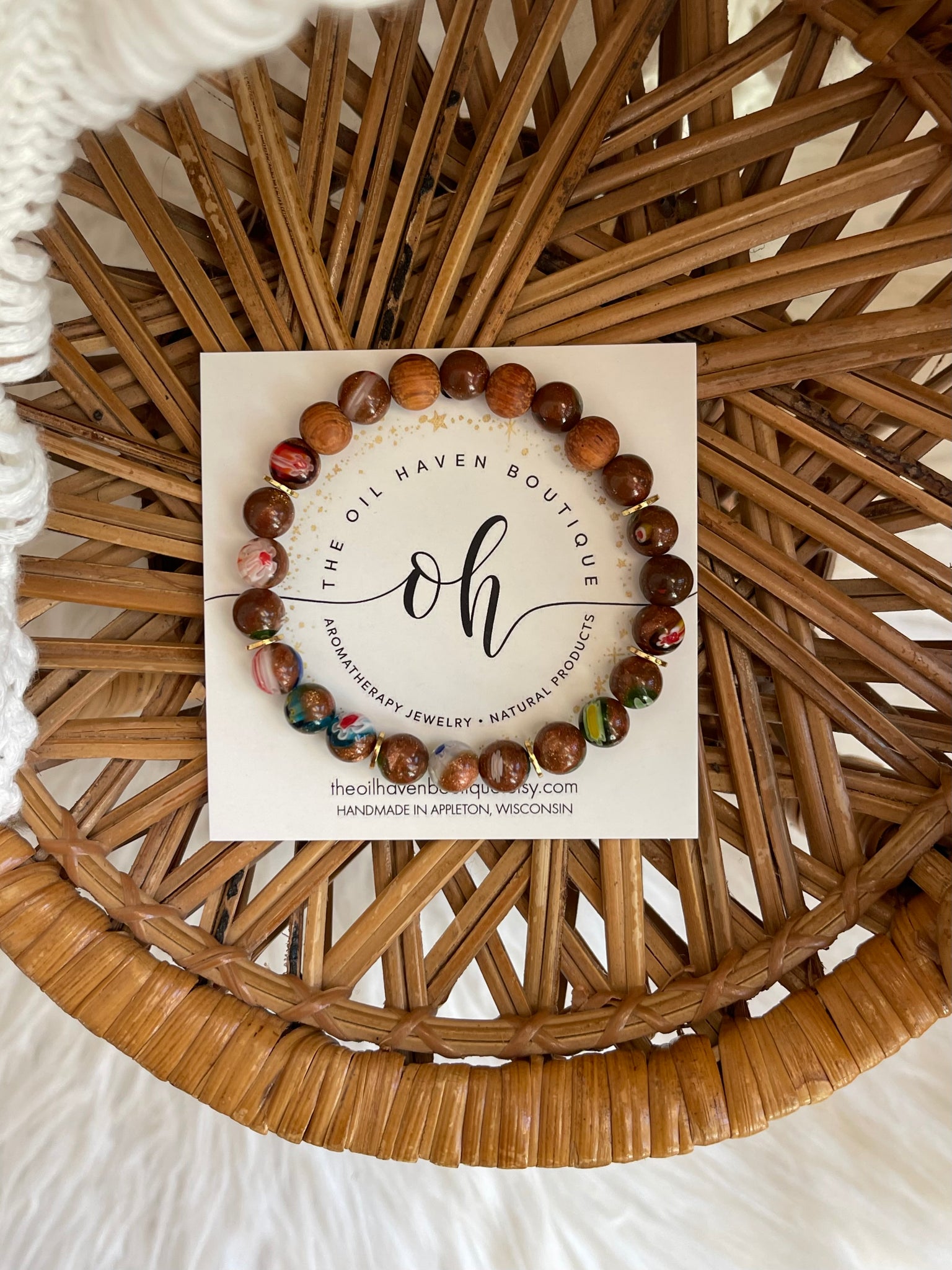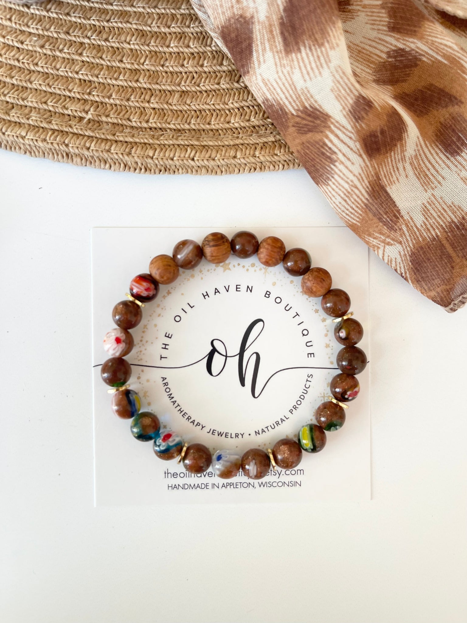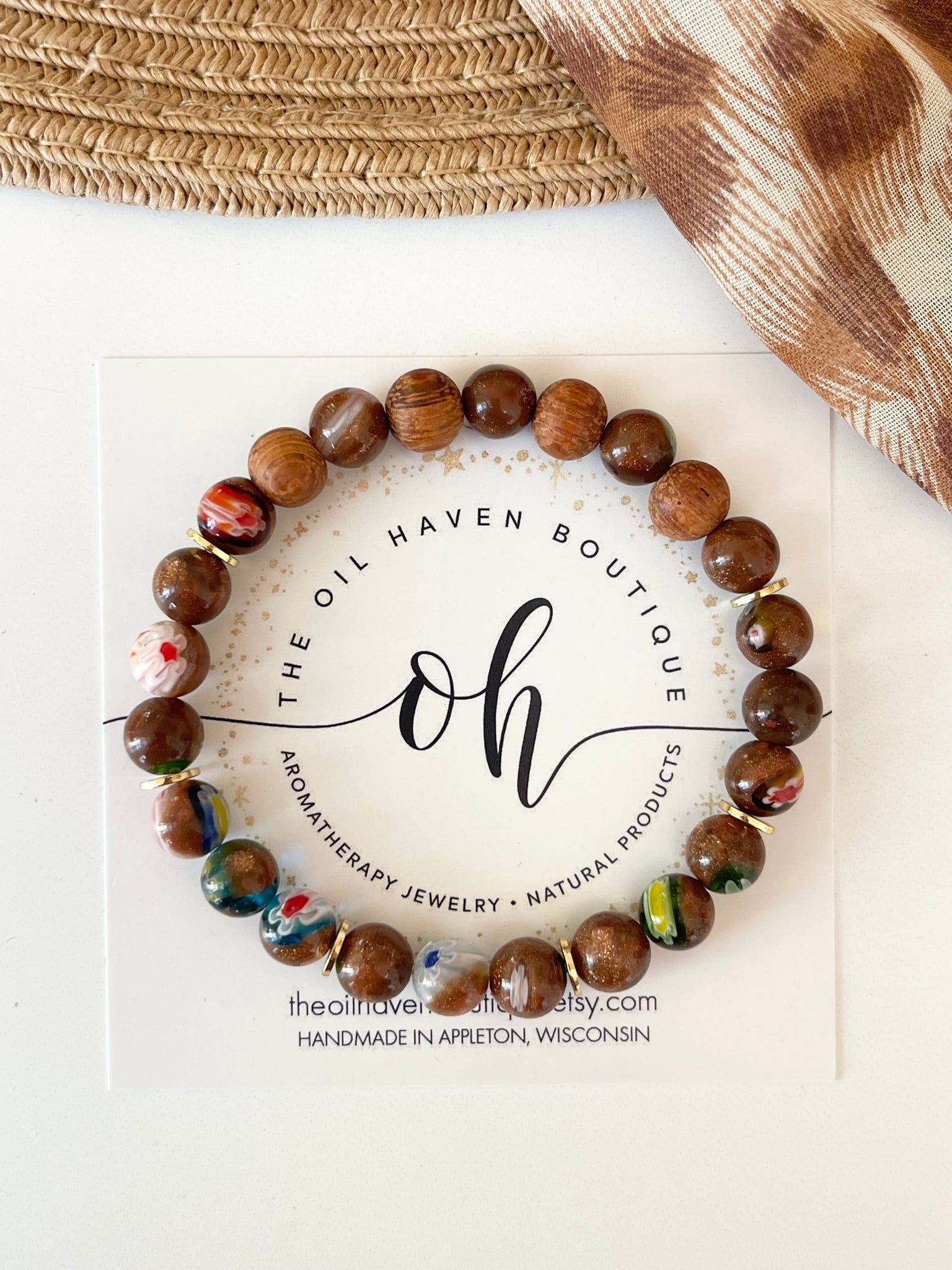 Beautiful miliforni sandstone beads, 18k gold slices and wood beads! Add essential oils to the wood beads for aromatherapy on the go!