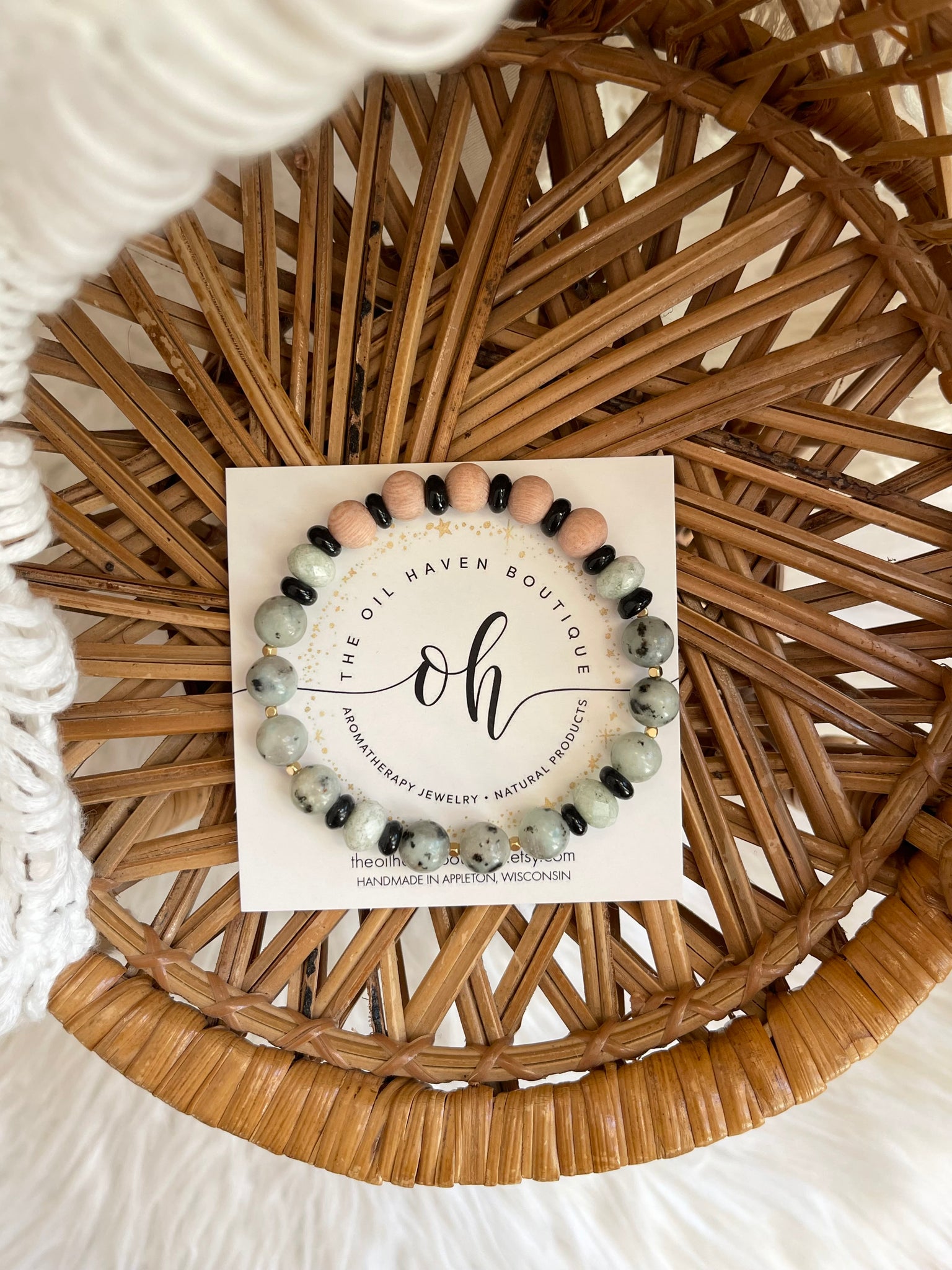 Kiwi Jasper, Czech beads, Black donuts with rosewood! Add essential oils to the wood beads and enjoy the therapeutic benefits all day!