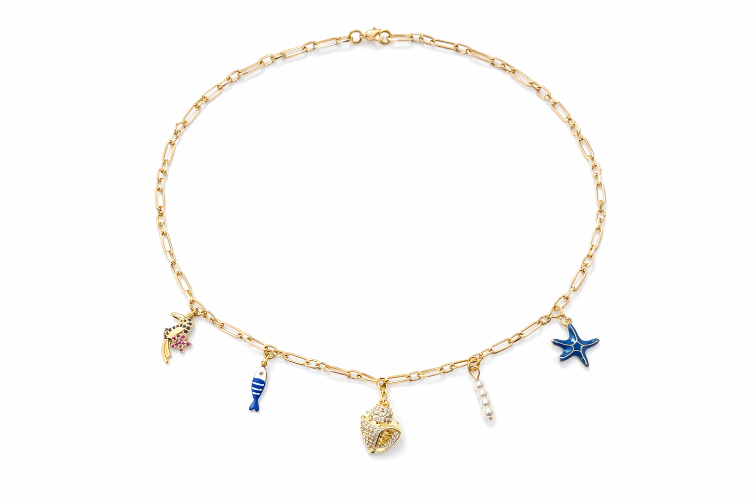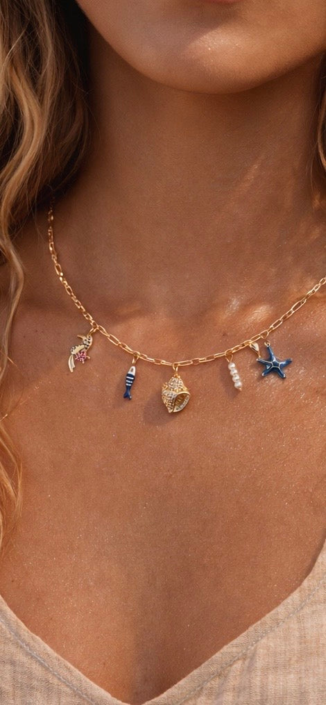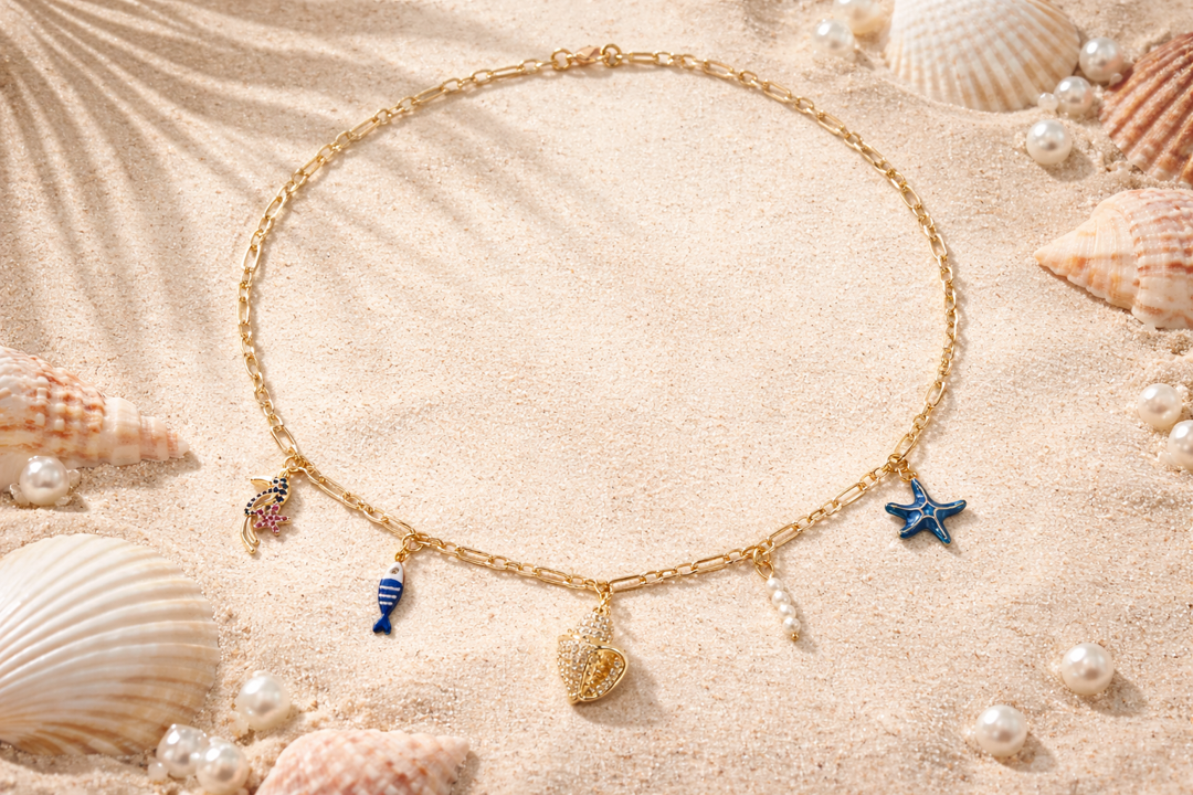 A dreamy coastal necklace designed for ocean-souls. Five hand-selected charms — starfish, shell, pearl, fish, and coral — tell a story of waves, salt air, and summer freedom. 18K gold-plated chain, lightweight, versatile, and made for sun-kissed skin.